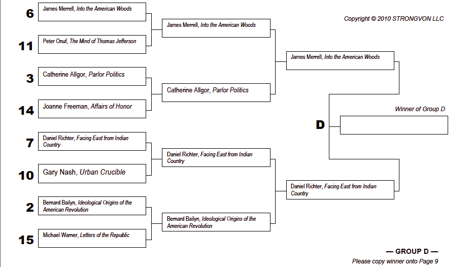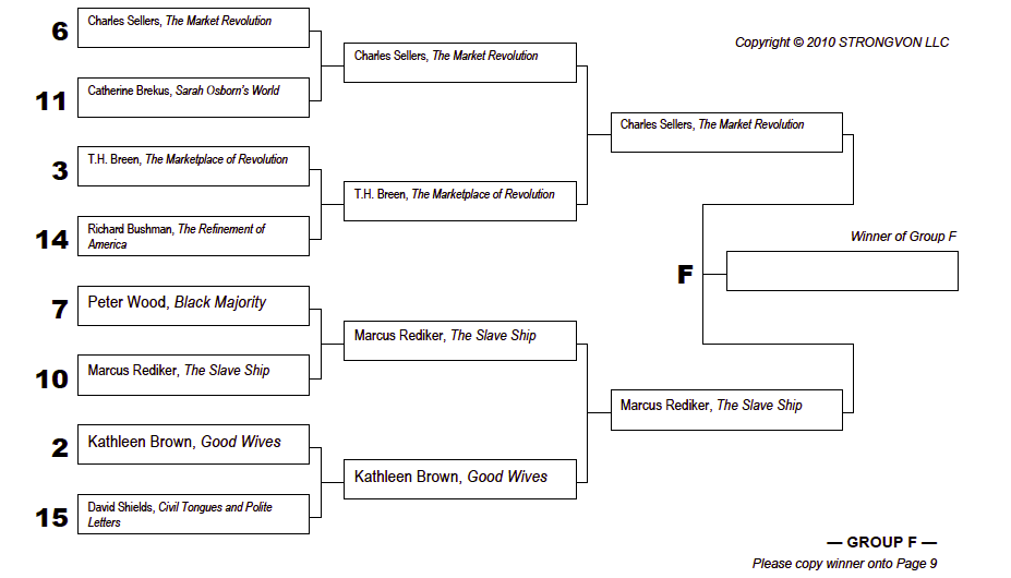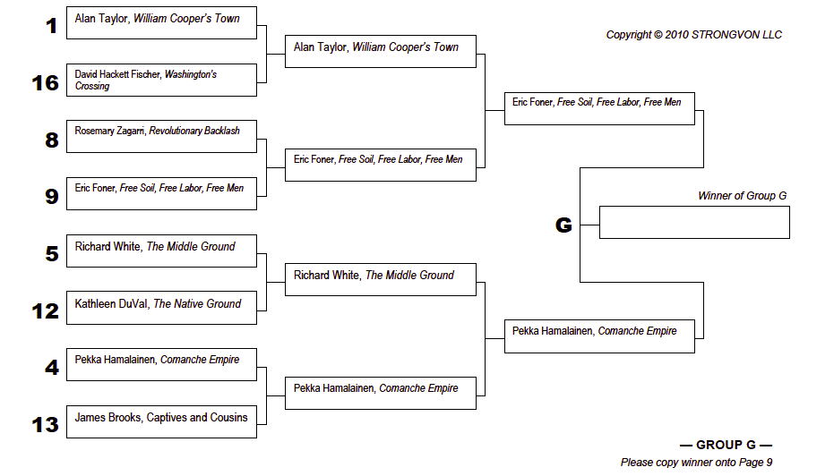 2. As for the low seed, keep an eye on Eric Foner. Tough match-up now against Pekka Hamalainen, but if he makes it through there, it sets up a matchup with a like-minded book (at least as much as this sort of tournament allows). And, with the books beginning to stand in as metonyms for their authors, who’d count out Foner against Berlin or Walter Johnson?