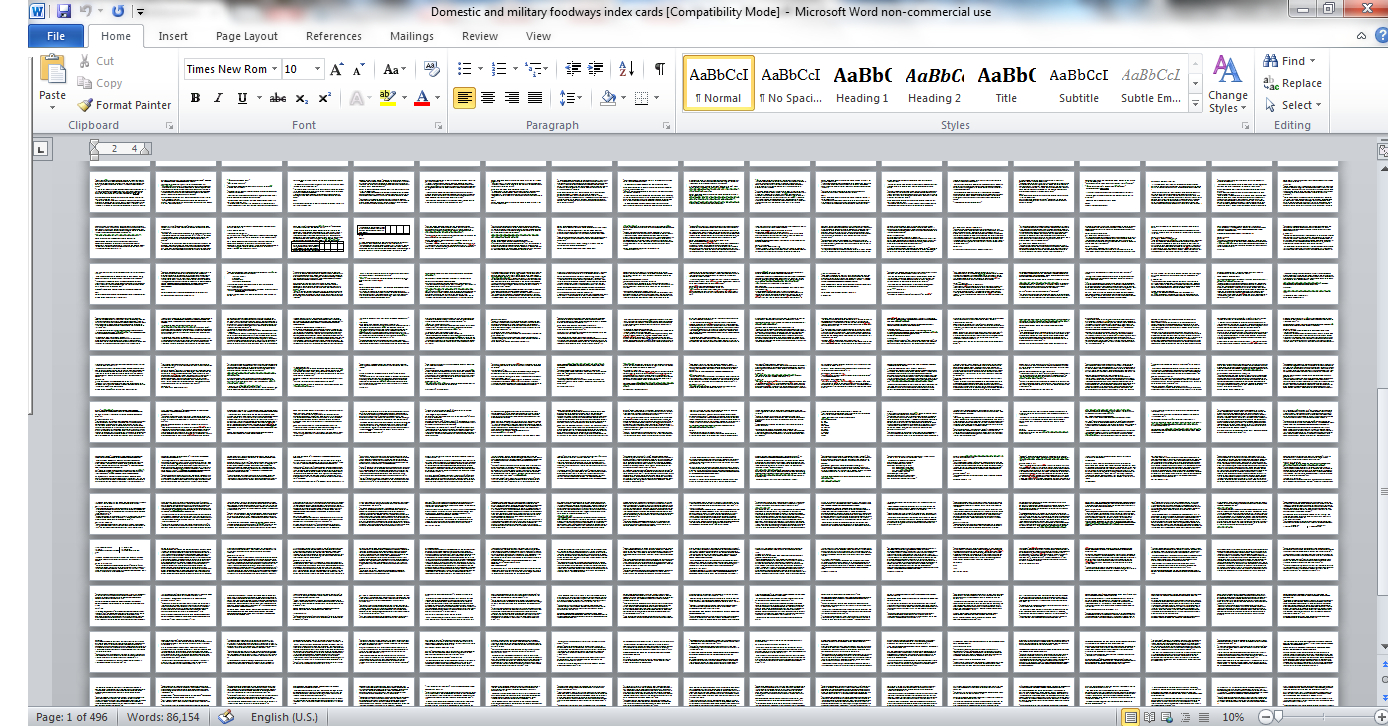 When the time came to write up a new chapter, I’d open up a new Word document and call it something like “Primary Sources, black Loyalists in Sierra Leone chapter.” Then, I’d go through my folders and open each document that seemed like it would contain a relevant collection. I’d copy and paste each document into the new Word document, alphabetizing by collection name. Once I was done adding in every potential collection, I formatted the document to 4 by 6 inches, shrunk the font (to save paper), and added page numbers. Then, I bought extra print cartridges, resigned myself to killing some trees, and printed everything out on index cards (each chapter usually ended up producing 200-500 cards). Sometimes, if chapter had a particularly thorny historiographical point that needed making, I’d do the same thing with my secondary source quotes.