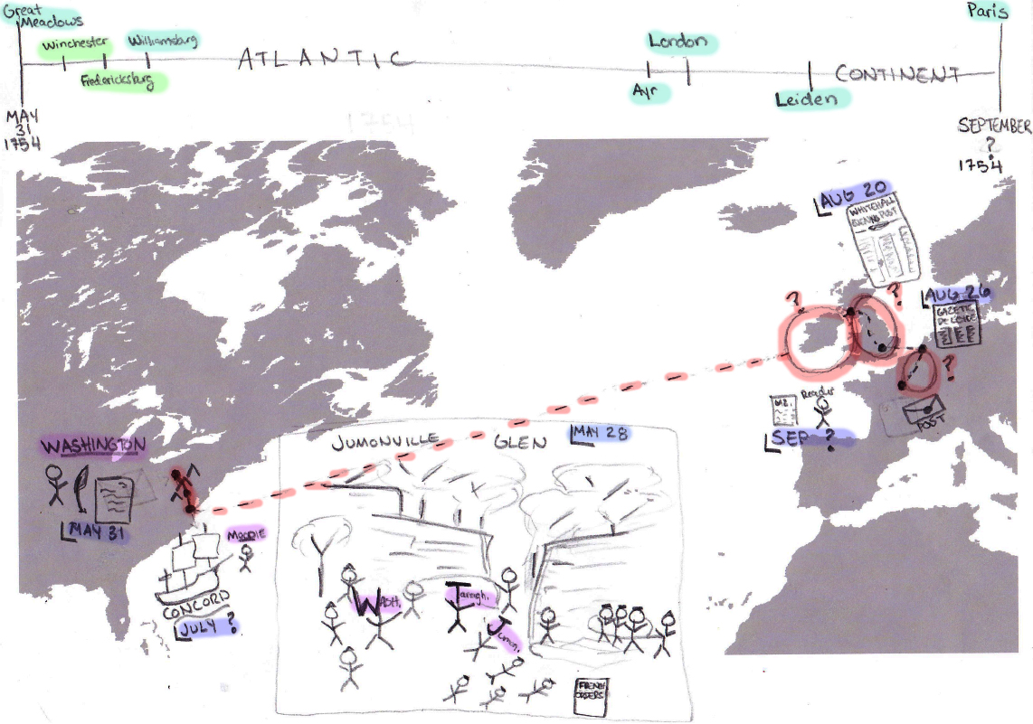 And there’s something more to it than just that. My freehand maps don’t truly function as maps, but rather as compilations of all my relevant information and thoughts. I have a whole binder (and dropbox folder) full of silhouetted maps of the Atlantic World, North America, and Western Europe, backgrounds I use to loosely sketch timelines, information routes, textual details, events, as well as to highlight important missing information.
