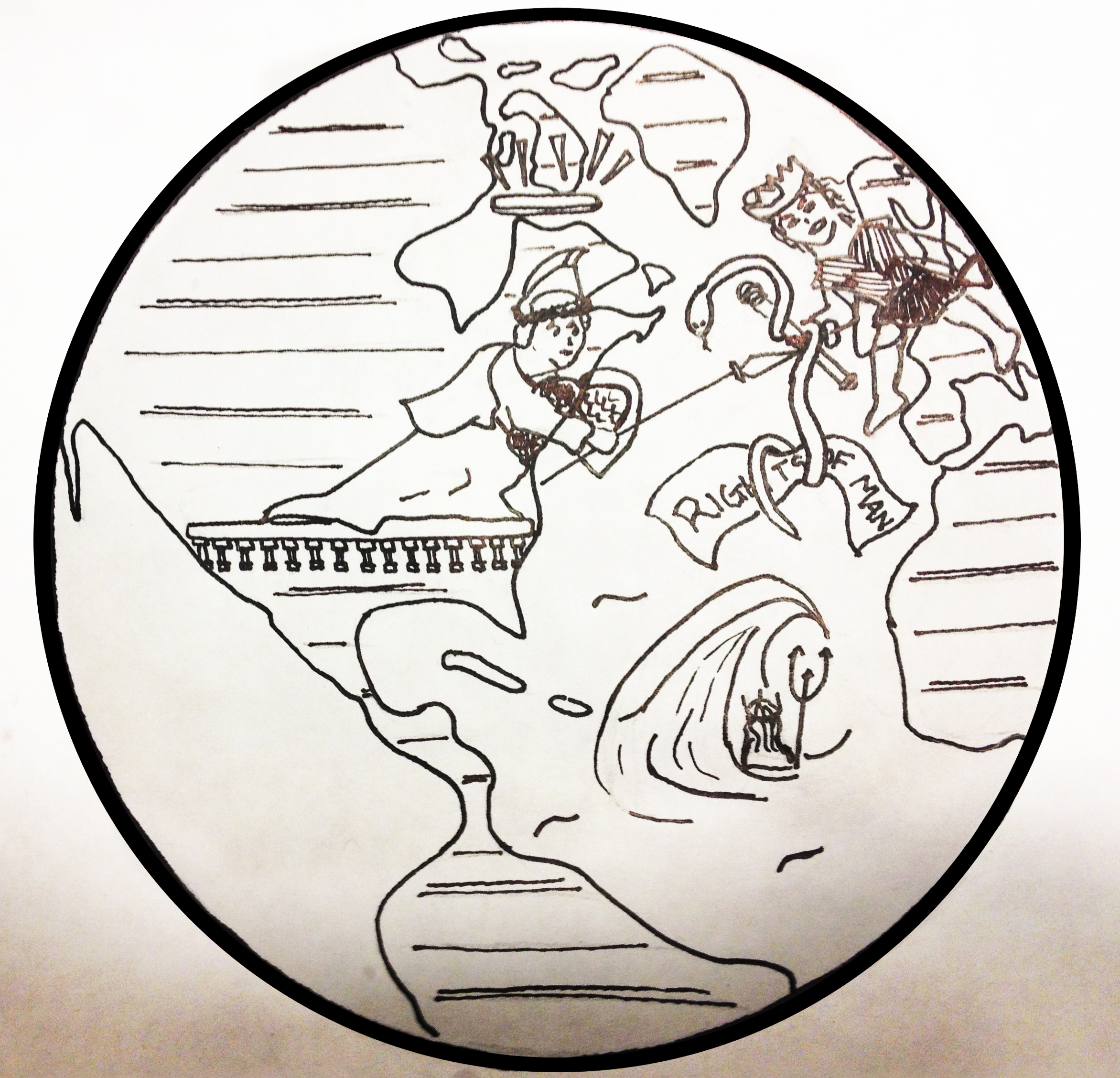 It’s one thing to read his description, which vividly features: Colossus, with an iron scepter entwined by a snake that is simultaneously strangling the words “Rights of Man,” striding across the sea towards Pallas, who stands poised to defend America’s honor with her radiated crown of glory and spear. (Hamilton’s description also adds: “It would improve the allegory to represent the Atlantic in a tempest, as indicative of rage, and Neptune in the position of aiming a blow at the Colossus with his trident.” Indeed.) It’s altogether another thing to see it—appalling in amateur hand—in all its grandiose mess. With other sources, I think of myself as poorly trained and inadequately skilled sketch artist: So often I find it helps to just quickly draw descriptions from travel accounts or newspaper items to get a better sense of looking through the eyes of my historical actors.
