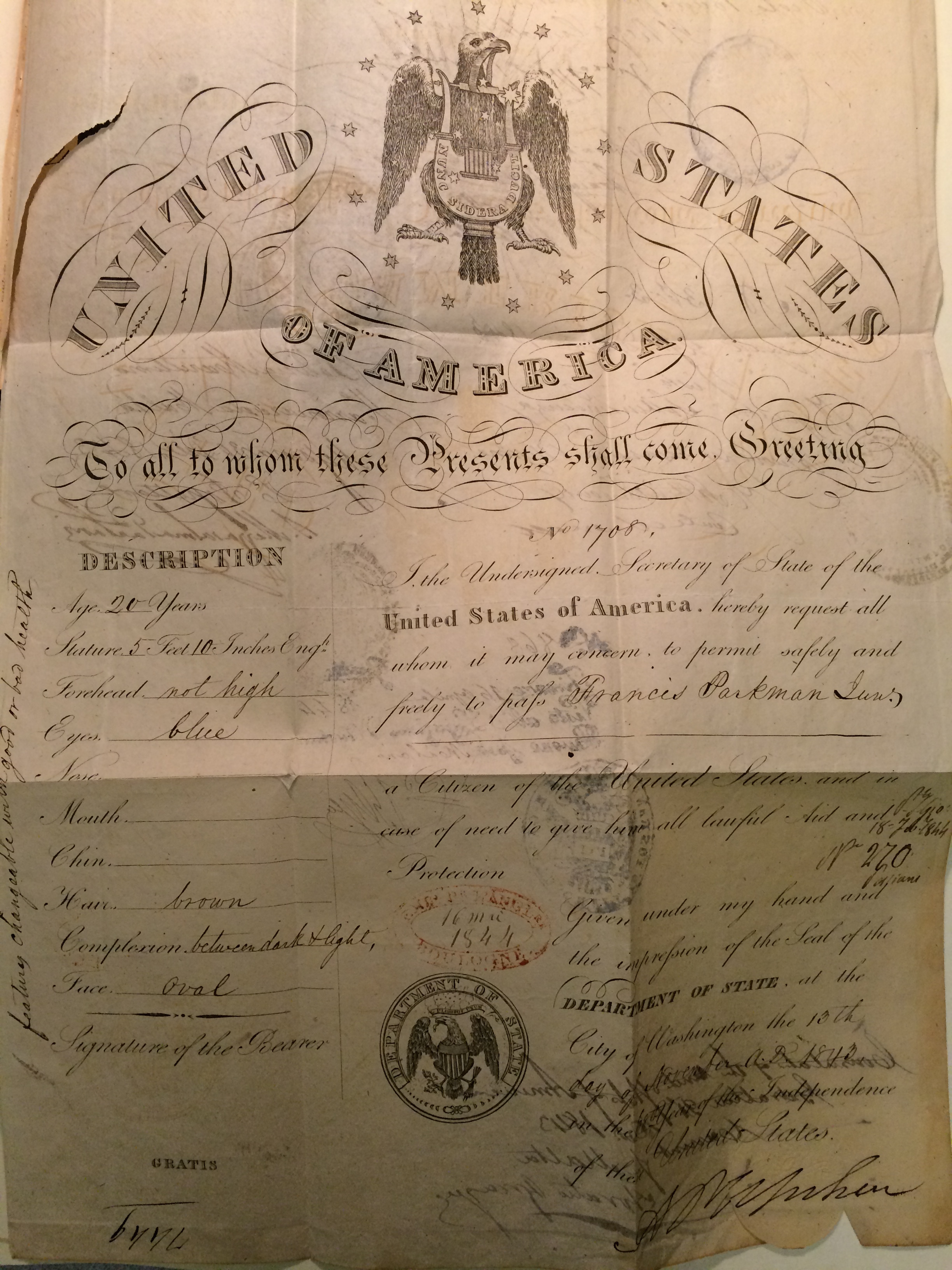 Digging into a side pocket for his jacket-knife and jawing it open with his teeth, he notched a single foothold. The whole ordeal, he reckoned, was neatly resolved in ten minutes’ time. Now, three years into fieldwork, he felt like a “perfectly cool” and seasoned explorer. He had haggled with drunken innkeepers, navigated rotten logs and rockslides, forded swollen brooks, and battled forest flies. His gaze matured. When he looked up—often with tired and “scorched eyes”—he saw ash-tipped mountain peaks stilting the “Yankee land” sky. Peering along Canada’s border and down the Connecticut River, he identified a string of frontier towns ripe for scholarly rediscovery. He paid local children (two cents or more) to scout out “curious caves” and odd landmarks. Pain—the blinding headaches and muscular discomfort that he called “my enemy”—made him work piecemeal. Often, he paused to catch up the narrative unspooling in his notebook, or, happily, to “loaf” around a new neighborhood. Strangers eyeing his American passport (below) met, in turn, a young man of “features changeable with good or bad health,” much like the lands he longed to see. This was Francis Parkman, before the Oregon Trail.