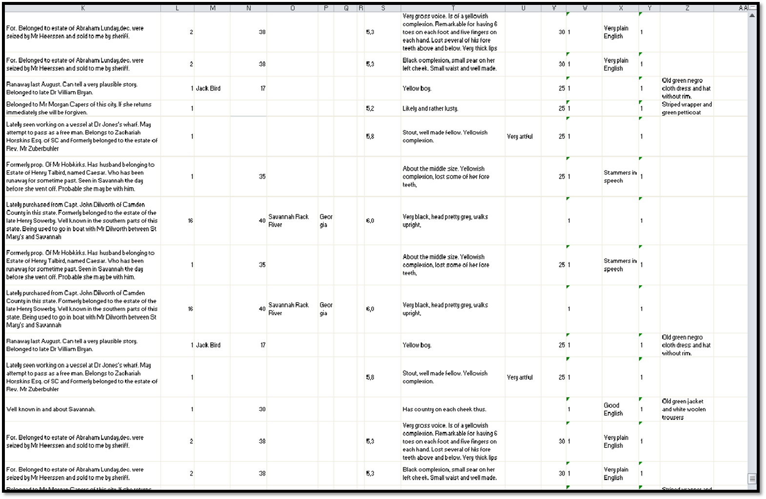 1. Shaun and others may be interested in a publication and ongoing project called People of the Founding Era: A Prosopographical Approach, that I run at Documents Compass (part of the Virginia Foundation for the Humanities which is a department of the University of Virginia). Funded by the Andrew W. Mellon Foundation, the project collects biographies from the published documentary editions of the Founding Fathers and other Founding Era projects such as the Dolley Madison Digital Edition and The Papers of Eliza Lucas Pinckney and Harriott Horry Pinckney. We are now working on the data from Tom Costa’s project at UVA-Wise on runaway slave ads. Tom has shared his data for more than 10,000 runaways slave ads from Maryland and Virginia newspapers, 1736-1803 (see http://www2.vcdh.virginia.edu/gos/). over the last two decades, Tom’s project analyzed each advertisement in much the same way you describe; that is identified different categories of information in the transcription of each ad: cloth, disease, physical characteristics, and speech, among others. This last category aligns with your “literacy status,” as you describe it. We hope to have all of these records processed and made available in the formal publication for searching and comparison in the next month or two. People of the Founding Era is a publication of UVA Press Rotunda and you can obtain trial access here http://pfe.rotunda.upress.virginia.edu/
