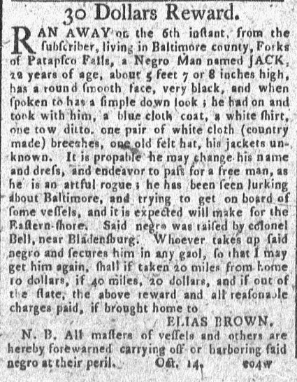 Screen Shot 2015-08-24 at 12.43.09 PMA “very ingenious artful fellow” appears a peculiar description of a runaway advertised for recapture. The advertisement, for Harry or Harry Johnstone, featured in Baltimore’s Federal Gazette newspaper, on May 2, 1800, at the request of Nicholas Reynolds, overseer of criminals for Baltimore County. Harry had absconded from Gotham gaol, near Baltimore. Reynolds described Harry as a “tolerable good blacksmith” and a “rough carpenter.” A “very talkative” slave, he was a man of “great address.” On first impression a relatively congenial description; in actuality, Reynolds’s use of the term “artful” condemned the runaway.[1]