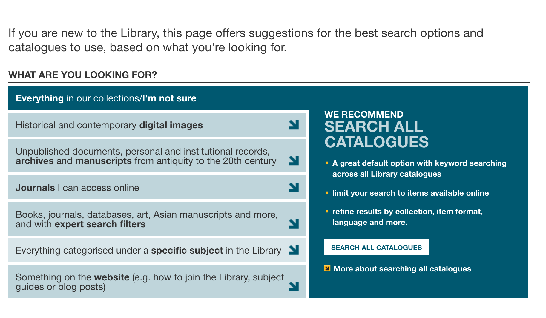 Screen Shot 2016-05-17 at 10.19.10 AMWellcome’s interface is very user-friendly and allows researchers to select from different catalogs. They provide a guide to help researchers decide which catalog to use, or an option to search across multiple catalogs simultaneously.