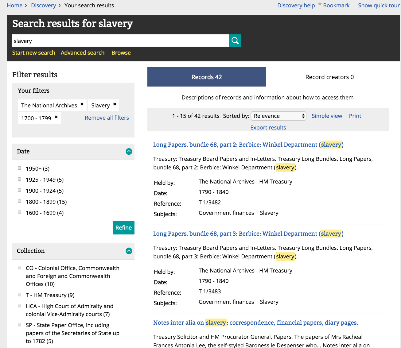 Screen Shot 2016-05-17 at 9.55.34 AM.pngThe Discovery catalog gives you two options. The first allows you to limit your search to NAUK holdings (Discovery is a central catalog that will allow you to search multiple UK archives at once). The second allows you to limit your search to documents that have already been digitized. Your search results will include a call number that tells you the record group and manuscript ID. For example CO = Colonial Office. TS = Treasury. HCA = High Court of Admiralty. SP = State Papers. There is a menu to the left that lets you filter your results by year range, record group, geographic location, etc. Click on individual manuscript numbers to request retrieval of documents. If you don’t have an active reader’s card, you can still complete a preliminary registration online and order some of your materials in advance. They will be brought up for you when you finish registering.