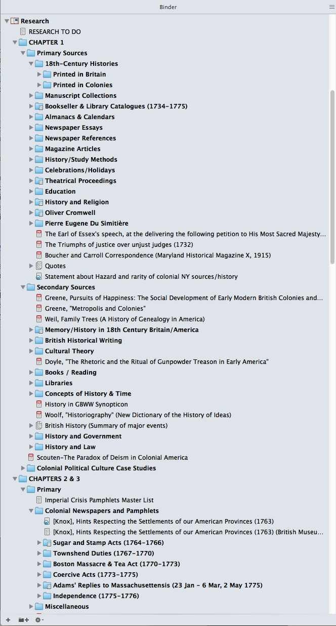 Within my main “Research” folder, I have created detailed layers of subfolders. So each chapter gets its own folder with subfolders labeled “Primary” and “Secondary.” Within both of those (which often correspond), I include subfolders for each of the chapter’s main themes and topics. Beyond that, you could decide to give each individual repository at which you did archival research its own subfolder. How you want to do it and how far you want to go is up to you but even the most complex number of layers of subfolders is easy to view and work with in the Binder. And, ultimately, that is the beauty of Scrivener and its Binder. Not only does it make managing a large amount of different materials easy, it also acts as a one-stop location for all of your research and writing together (my Scrivener project file contains over 4,000 individual files and totals 26.8GB).