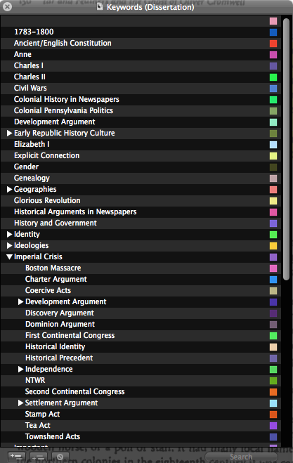 I can’t upload pictures here but each document also gets a “Label” and “Status” drop-down menus, which you can customize. So for the former I use “primary source,” “secondary source,” etc… And for the status, I use things like “To Do,” “In progress,” “Completed,” and a number of others. The keywords I described above in the piece, which is probably the main way of traditionally tagging your documents. Finally, each document also has a “Metadata” tab in the right sidebar for which you can customize the fields. All of these things occur in the right sidebar. In addition, Scrivener’s search function is excellent and allows you to search for keywords in any part of the document or attending information/metadata/comments.