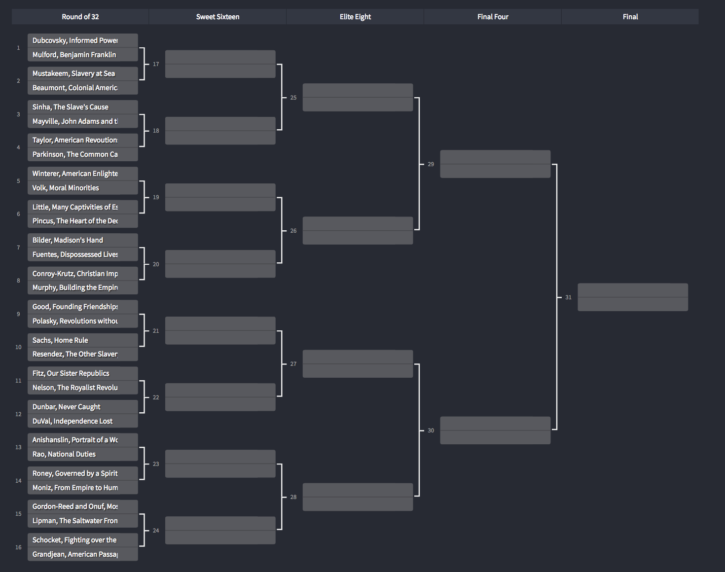 Welcome one and all to the 5th annual Junto March Madness (#JMM17). This year’s tournament will cover books in early American history (broadly defined) published since 2014. There are, however, a few key differences from past years. First, this year’s tournament will feature 32 books rather than 64. Moreover, we have decided to forego the open nomination process. The 32 works in the bracket below were selected by the 25 members of the blog. Before voting begins, let me also offer our usual disclaimer: JMM is meant to be fun and to expose more people to excellent recent scholarship on early America. It is not meant to determine the “best” book on early American history since 2014 but to show the favorites of our readers. As always, we encourage participants to use both the comments here on the blog and our hashtag (#JMM17) to discuss these works. With that out of the way, here is this year’s bracket (click for full-size):