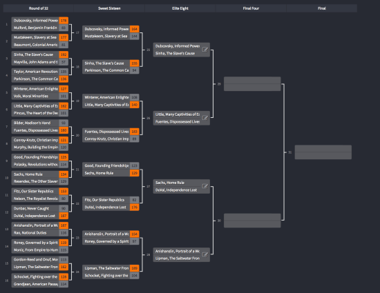 We are down to the Elite Eight. See the results and updated bracket below and then vote for your favorites of the eight books left standing.
