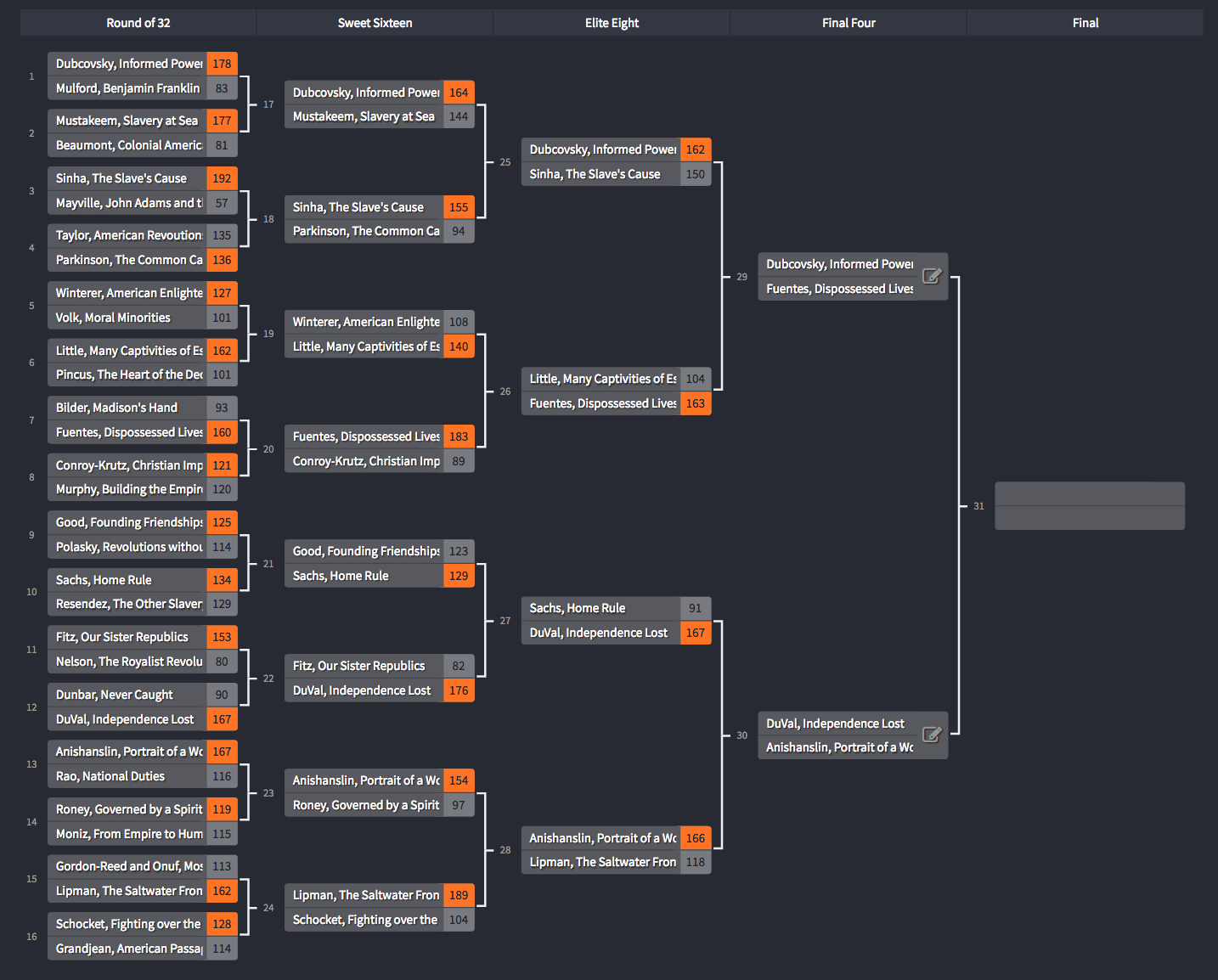 We are down to the Final Four. See the results and updated bracket below and then vote for your favorites of the four books left standing.