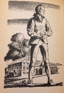 Age 14 when the book’s action opens, Johnny Tremain turns into a sort of fictional George Robert Twelves Hewes, a historically insignificant figure who nonetheless turns up at key moments in the escalating crises in Boston.[1] A mere apprentice to a not-very-successful silversmith, Tremain nonetheless finds himself engaging in shop talk (literally) with Paul Revere. He negotiates business deals with John Hancock, and engages in political work for the Sons of Liberty, which puts him in conversation with Hancock, Samuel Adams, and Dr. Joseph Warren. He shows up at the Boston Tea Party and somehow makes his way out of the city to Lexington on April 19, 1775.