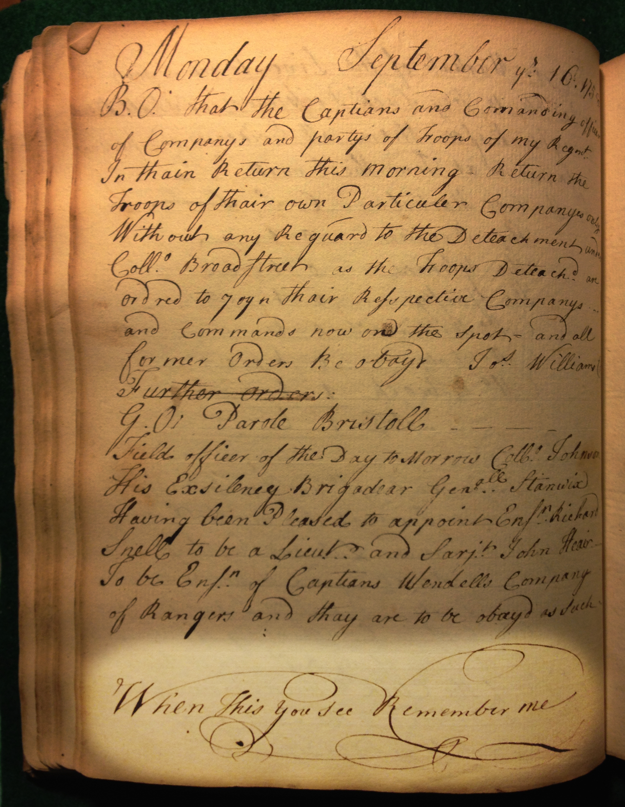 When wading through account books, muster rolls, and other dry military records, I don’t usually get a sense of the author—there might be a name jotted down, or maybe some distinctive handwriting, but hardly any evidence of personality. Reading through a 1758 orderly book from the Oneida Carry was much the same: a recounting of paroles, provisions, parades, and troop preparations. And then, curiously, tucked between the routine orders and work details, on the bottom of the 51st page:
