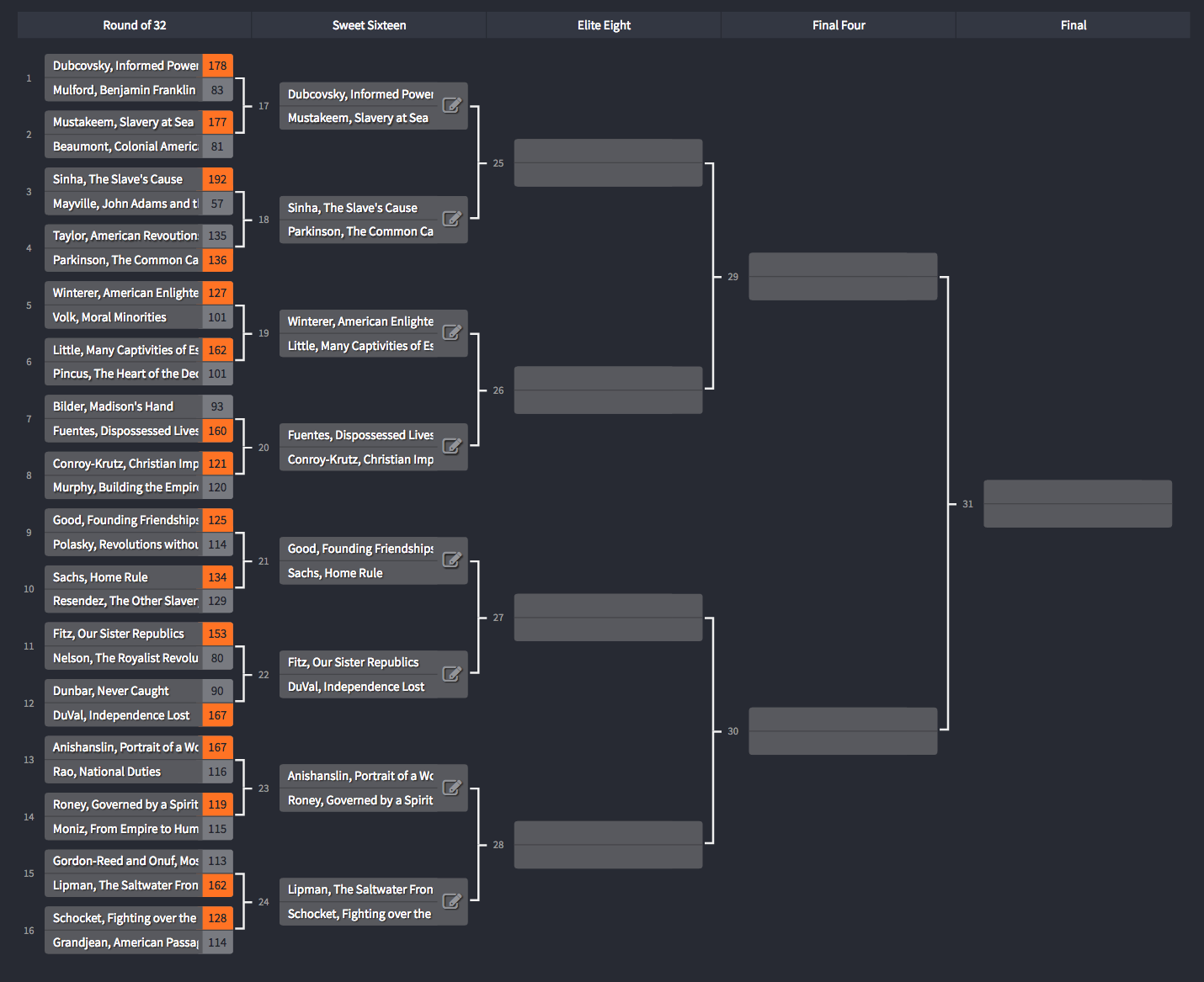 It’s once again March and that can only mean one thing at The Junto: our March Madness tournament. We skipped last year to welcome our new members, so in case you’ve forgotten: you nominate, we bracket, and you vote. In previous years, we have hosted tournaments of books, articles, and primary sources in early American history.
