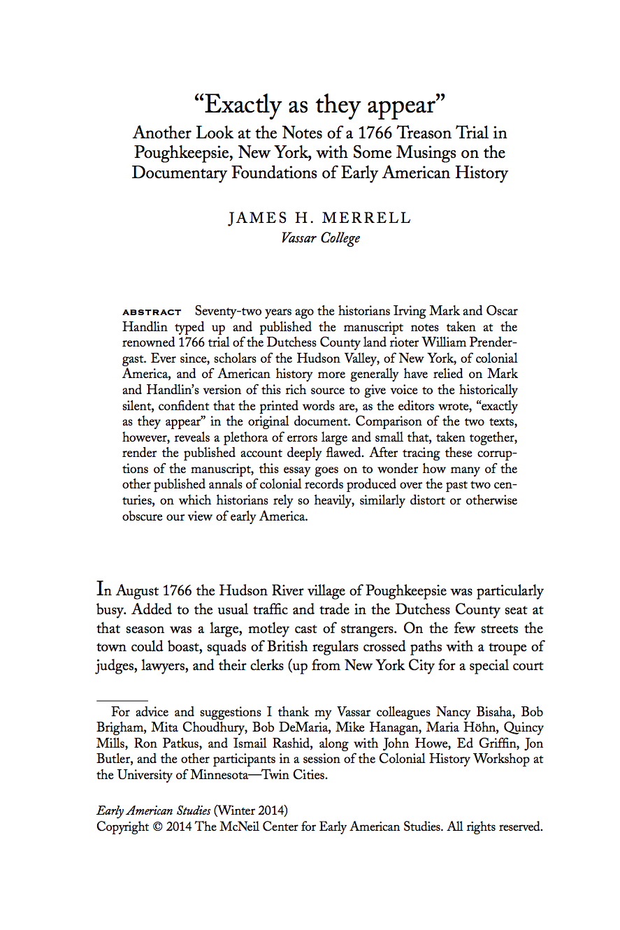 Rachel Herrmann concludes our roundtable on James Merrell’s article, “‘Exactly as they appear’: Another Look at the Notes of a 1766 Treason Trial in Poughkeepsie, New York, with Some Musings on the Documentary Foundations of Early American History” from the most recent issue of Early American Studies.